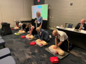 The organizers for the wellness session were Priscilla Dubé of Bergeron, Paradis, & Fitzpatrick, Bar Counsel Mike Kennedy, and Tamara McLaughlin. McLaughlin is an EMT and owner of Vermont Safety Net. Her company develops and delivers medical-based training. Dubé was the prime mover behind the session. She got in touch with the VBA to call to our attention that while all our courthouses are equipped with defibrillators, not many people have the first idea what to do with them in the event of an emergency. She also observed that many attorneys have clients and colleagues who may be struggling with addiction or mental health issues that might require intervention. Mike Kennedy gave some insights on his longtime theme of attorney wellness and good Samaritan laws. McLaughlin brought a full complement of training equipment (CPR mannequins, “choking vest” and Narcan for all – a first for a VBA takeway). Hands-on demonstrations and a lively session ensued.