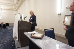 The first award went to the very recently retired Vermont Supreme Court Associate Justice, Karen R, Carroll. Justice Carroll retired from the court at the end of August. Her long and distinguished career encompassed work as a state prosecutor, a U.S. Attorney, and as a Vermont superior court judge. She was sworn in as an Associate Justice of the Vermont Supreme Court by Governor Scott in April 2017. Josh noted Justice Carroll’s contributions, particularly to access to justice efforts in the state. Justice Carroll, noting that she had to pull her work clothes out of the closet once more, graciously accepted the award. She offered words of encouragement for carrying on the important work of making justice available to all Vermonters.