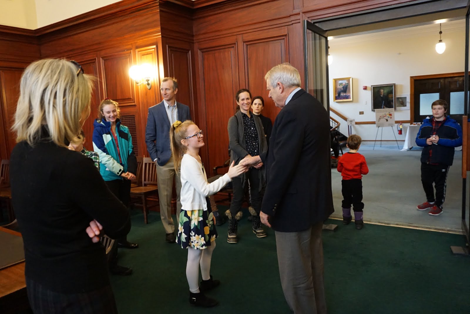 Chief Justice Reiber took some time to meet each winner individually, congratulated all of the students, and spoke to the importance of Dr. King’s legacy. He told the guests the story of his colleague the Honorable Jimmie M. Edwards who came all the way from St. Louis, Missouri to Vermont Law School on Tuesday for a Martin Luther King, Jr. celebration to speak about his work mending the communities surrounding Ferguson, near St. Louis. Amidst the inquisitive students, Chief Justice Reiber also described how decisions are deliberated, written and published. And for a most special treat, the guests were treated to a tour of the Court’s chambers, back stairway and the individual Justice’s offices and chambers. The students were fortunate to be able to meet four of the Justices and pose with the Justices for pictures.
