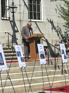 Justice Reiber spoke next, noting how Supreme Court business was originally conducted rotating hearings among courthouses in shire towns. The ceremony proceeded to go through a brief history of each county, in order of establishment, with VBA President Dan Maguire presenting each county’s presiding judge and County Bar President with a marble plaque, made of marble from the original Court’s construction. Each presiding judge, or designee, read fascinating stories about the birth of their county and its courthouse. More detail for each county and their landmark cases can be found in Paul Gillies’ essay, HERE. First up was Bennington County.