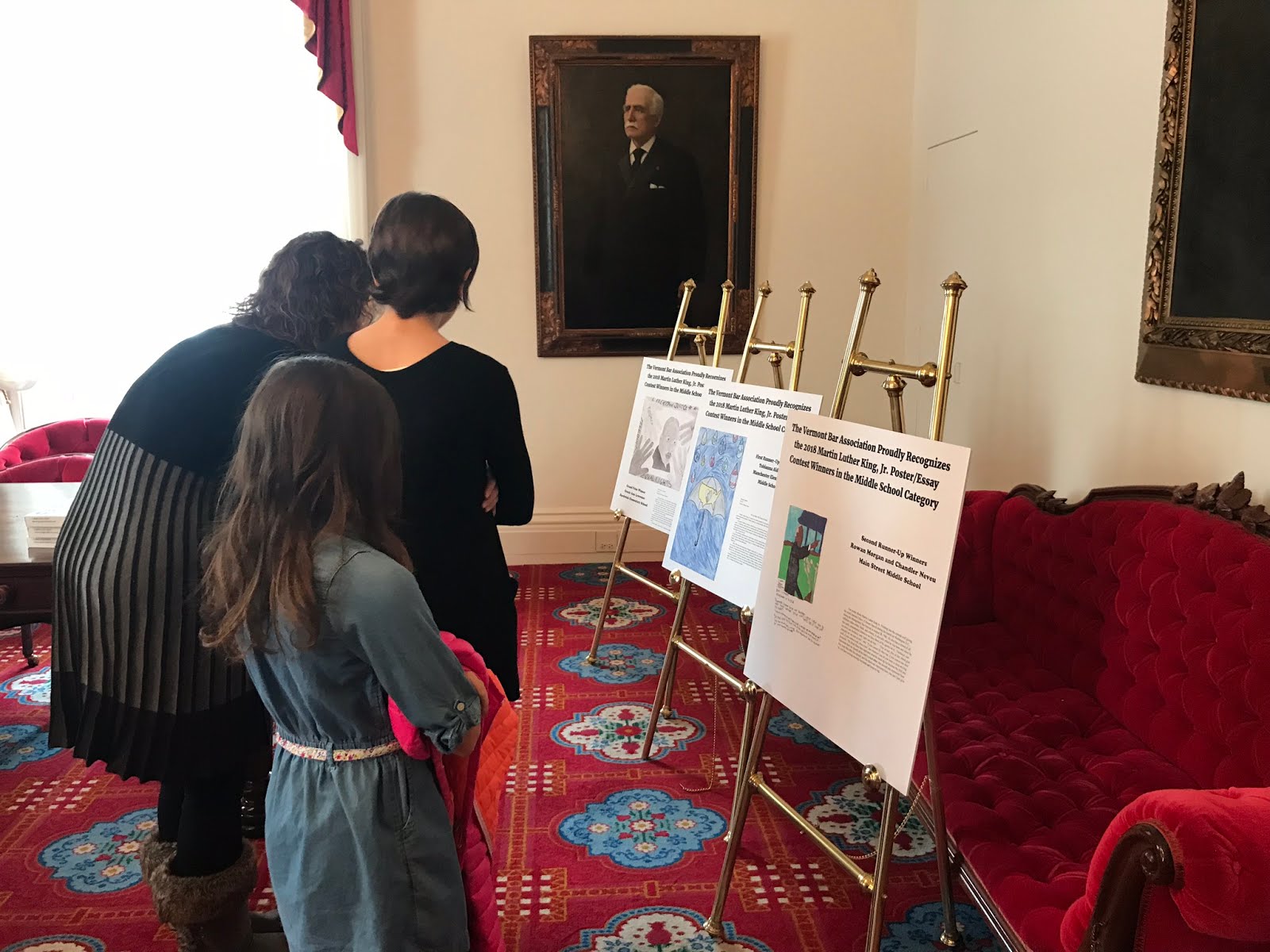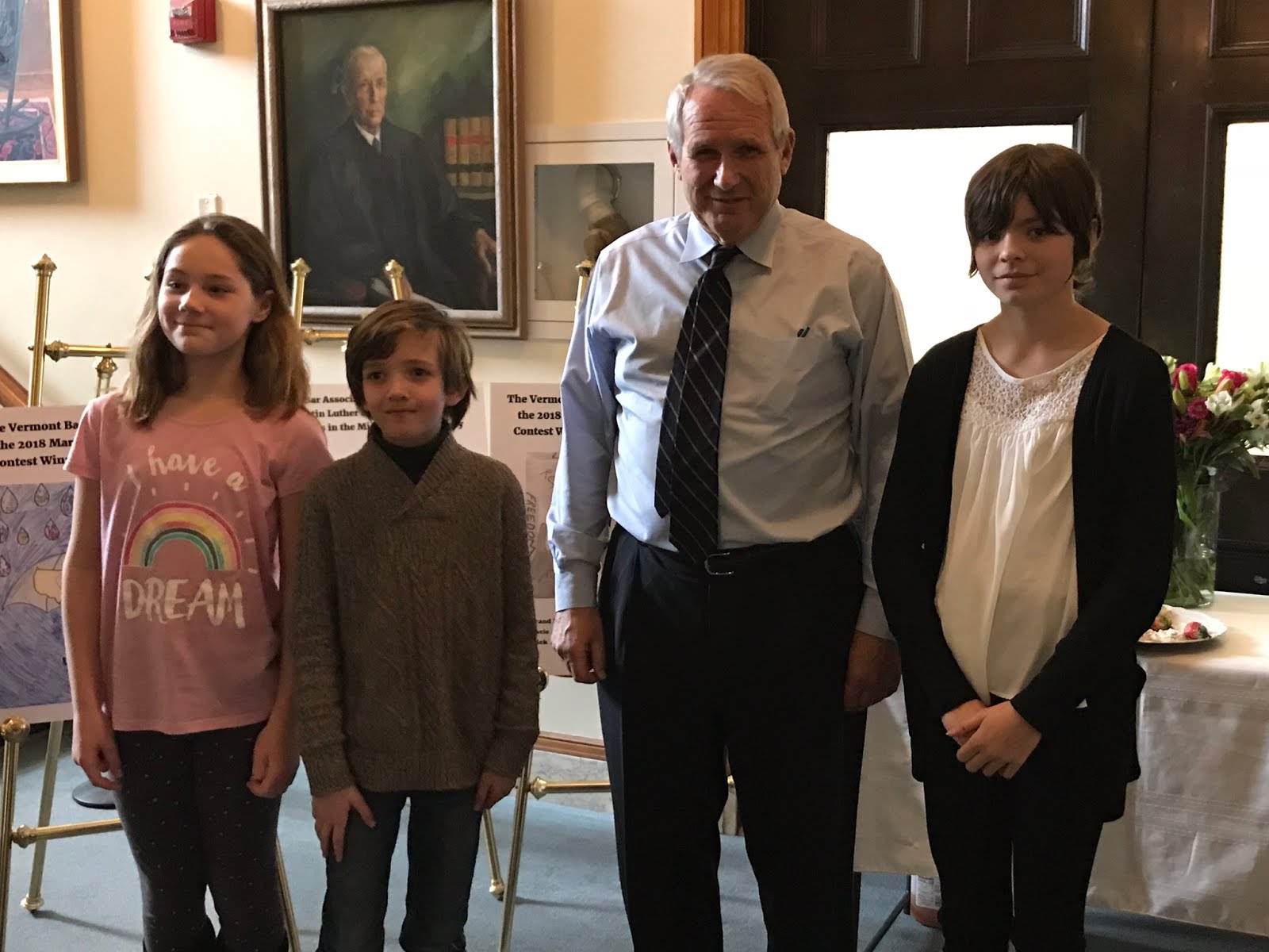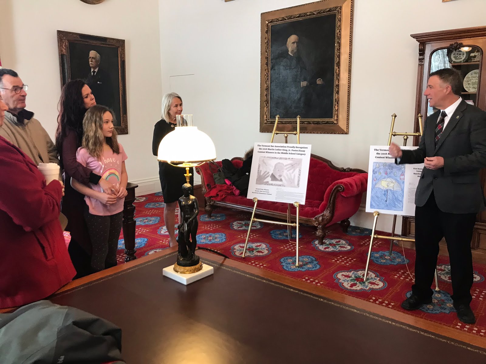 The students and their teachers and families were photographed with their winning submissions and Governor Scott. The Governor spoke of the importance of Dr. King’s message today, including the importance of being kind to one another and to “tweet others as you would like to be tweeted” on social media. After the ceremony, the group attended a statehouse tour and then were invited to the Vermont Supreme Court where they were greeted by Chief Justice Paul Reiber. Justice Reiber congratulated the students, handed out VBA pocket constitutions, and spoke to the importance of the historic document and of Dr. King’s legacy.