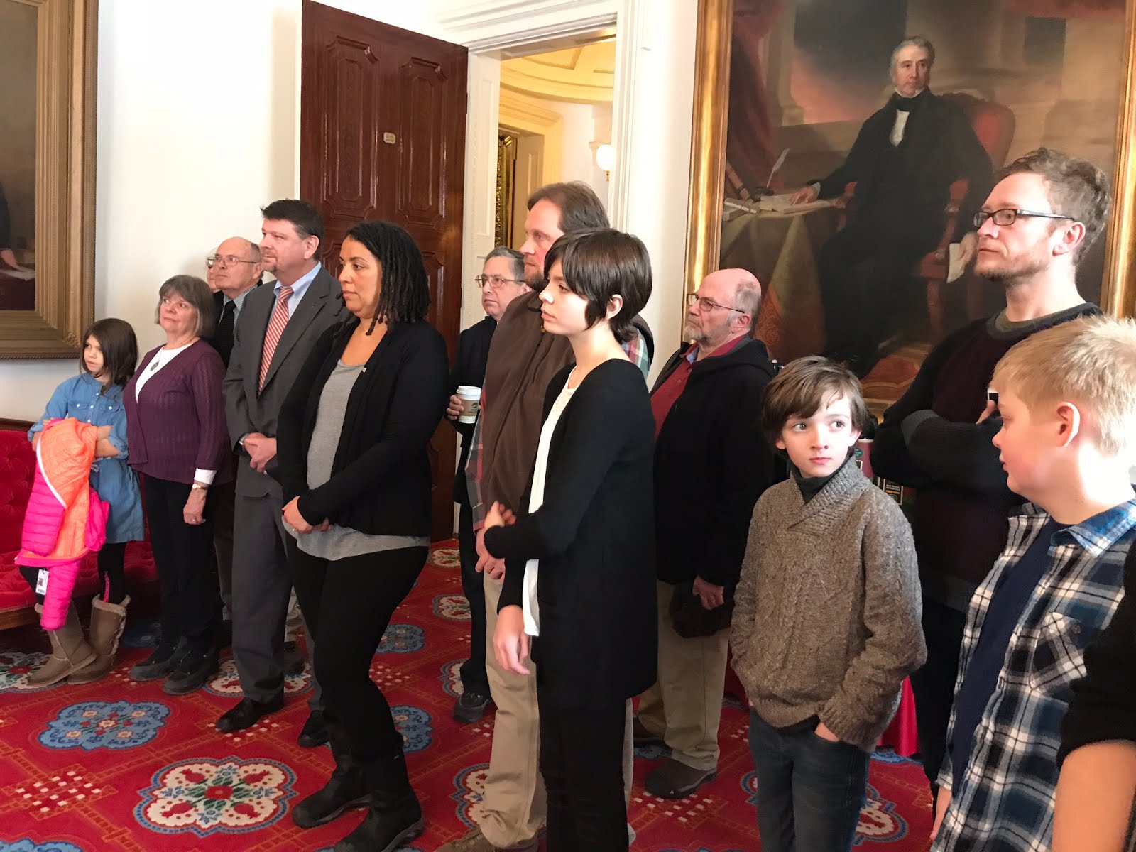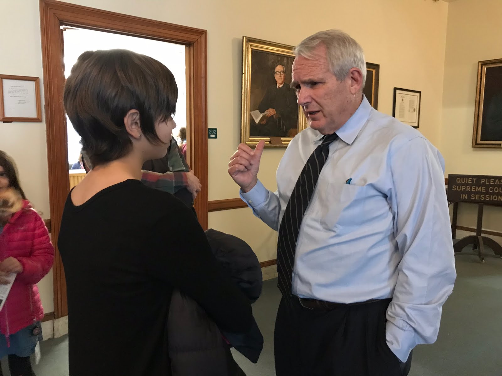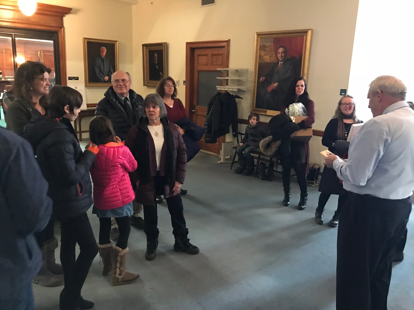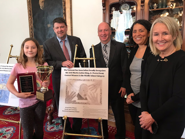 The students and their teachers and families were photographed with their winning submissions and Governor Scott. The Governor spoke of the importance of Dr. King’s message today, including the importance of being kind to one another and to “tweet others as you would like to be tweeted” on social media. After the ceremony, the group attended a statehouse tour and then were invited to the Vermont Supreme Court where they were greeted by Chief Justice Paul Reiber. Justice Reiber congratulated the students, handed out VBA pocket constitutions, and spoke to the importance of the historic document and of Dr. King’s legacy.