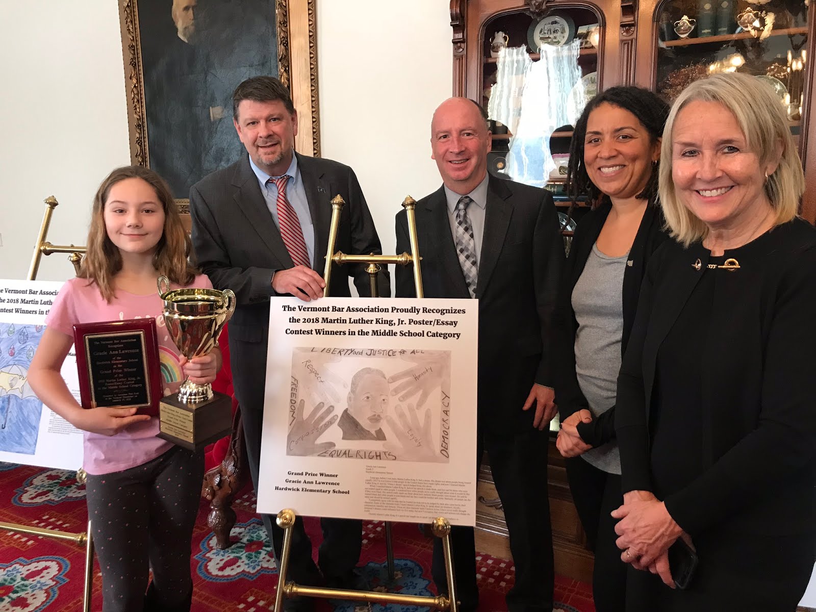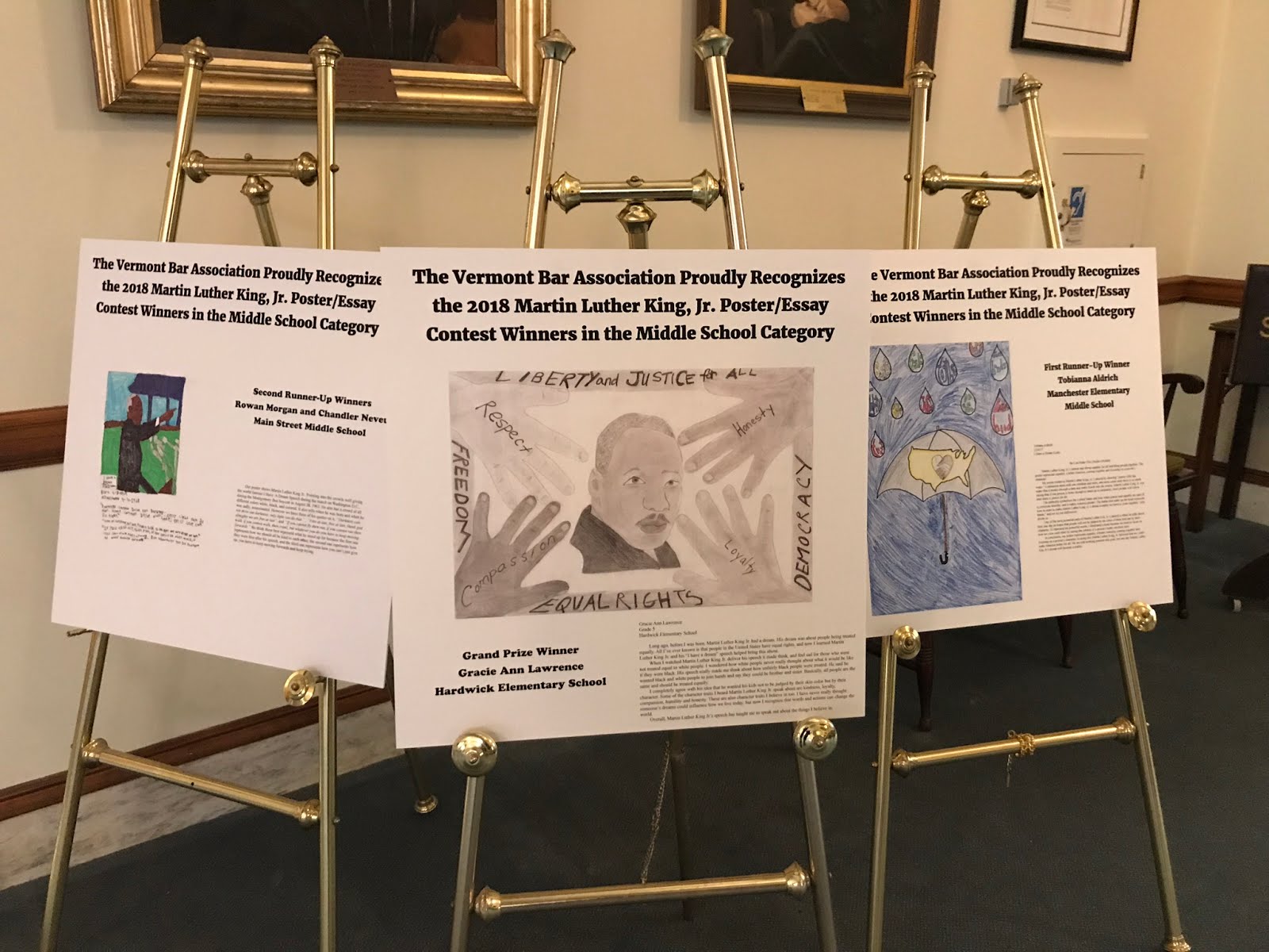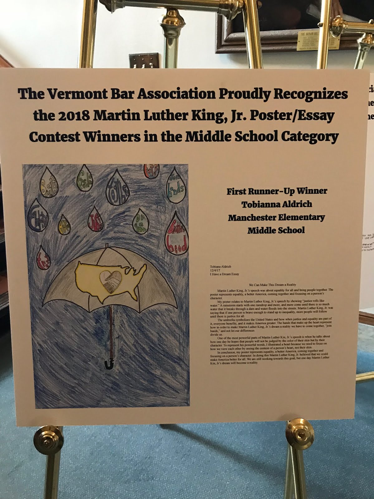 The Vermont Bar Association, in partnership with its Diversity Section and Young Lawyers Division, sponsored a Martin Luther King, Jr. Poster-Essay Contest to celebrate the life and message of the late Dr. Martin Luther King, Jr. Middle school students were asked to create a poster and write a short essay interpreting what Dr. King’s famous “I Have a Dream” speech means to them. One winner and two runners-up were selected by the committee from many beautiful and thoughtful entries from all over the state.
