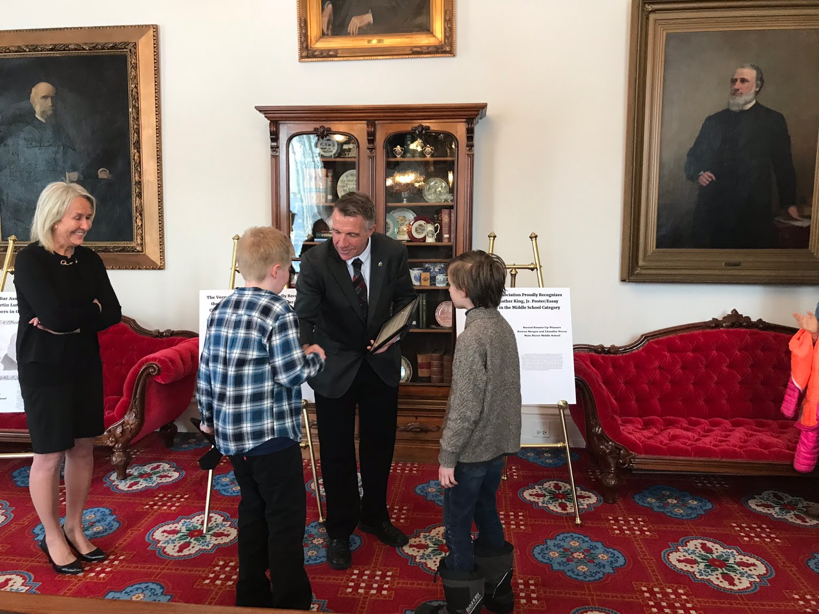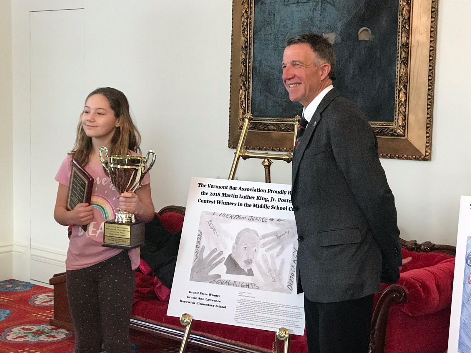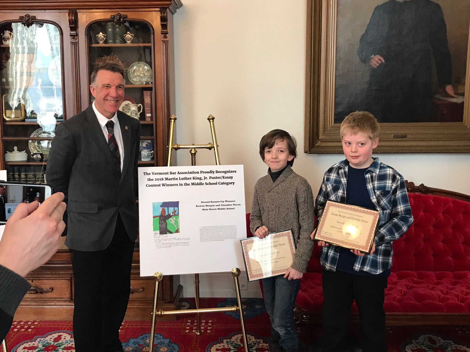 Governor Phil Scott presented awards to the winning students at the Statehouse on January 17, 2018. Gracie Ann Lawrence, a 5th grader from Hardwick Elementary School in Hardwick, was presented with the first-place plaque and traveling trophy for her school. Tobianna Aldrich, an 8thgrader from Manchester Elementary-Middle School in Manchester, received the first runner-up plaque and the team of Rowan Morgan and Chandler Neveu, both 5thgraders from the Main Street Middle School in Montpelier, received the second runner-up plaque.
