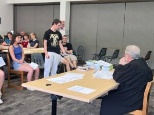 The students were separated into two groups – one representing the administration and the other the student protestors. The volunteers discussed the famous U.S. Supreme Court free speech cases of Village of Skokie v. National Socialist Party (1978), and Cox v. New Hampshire (1941) with the kids. They spent some time learning the legal standards and preparing to discuss points and make arguments in support of their positions and then two advocates were chosen from each team to plead their case to Judge Tomasi (who wore his robe!) The court convened with Heather Devine serving as bailiff, insuring courtroom demeanor was observed. Each side had approximately 10 minutes to make their case. The Judge didn’t render a decision, but he did ask questions of the “litigants.” The students proved very capable of thinking on their feet and discussing questions not raised during the group discussions.