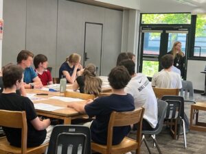 The volunteers began with introductions and shared stories of their paths into their legal careers. The kids then got a quick lesson in the First Amendment right of peaceful assembly so that they could grapple with a hypothetical fact pattern involving a planned protest of the Israel-Hamas war on a college campus.