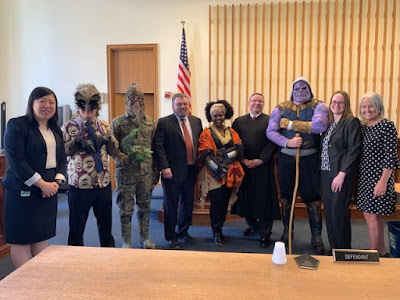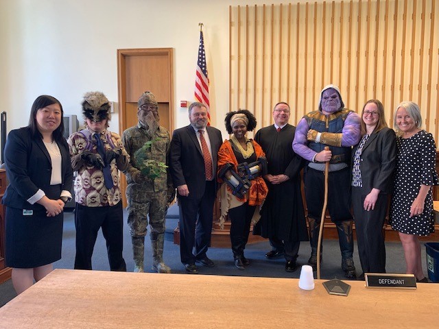 Rutland lawyer Shannon Lamb (Pratt Vreeland Kennelly Martin & White) represented the archvillain Thanos, played convincingly by Rutland lawyer Tom Bixby (Law Office of Thomas Bixby) in full Masters of the Universe garb. Rutland Probate Judge Karl Anderson wrote the script and represented Shuri, Princess of Wakanda, played enthusiastically by Vermont Assistant Attorney General Phyllisa Jones Prescott. Rutland lawyer Elijah LaChance (Ryan Smith & Carbine) dressed the part of Rocket, the snarky raccoon, who testified as a fact witness and also as a translator for Groot, the talking tree. Groot was played quietly by Rutland lawyer Jim Levins (Tepper Dardeck Levins & Fitzsimons), as Groot is only capable of repeating “I am Groot,” thereby the need for a creative translator.