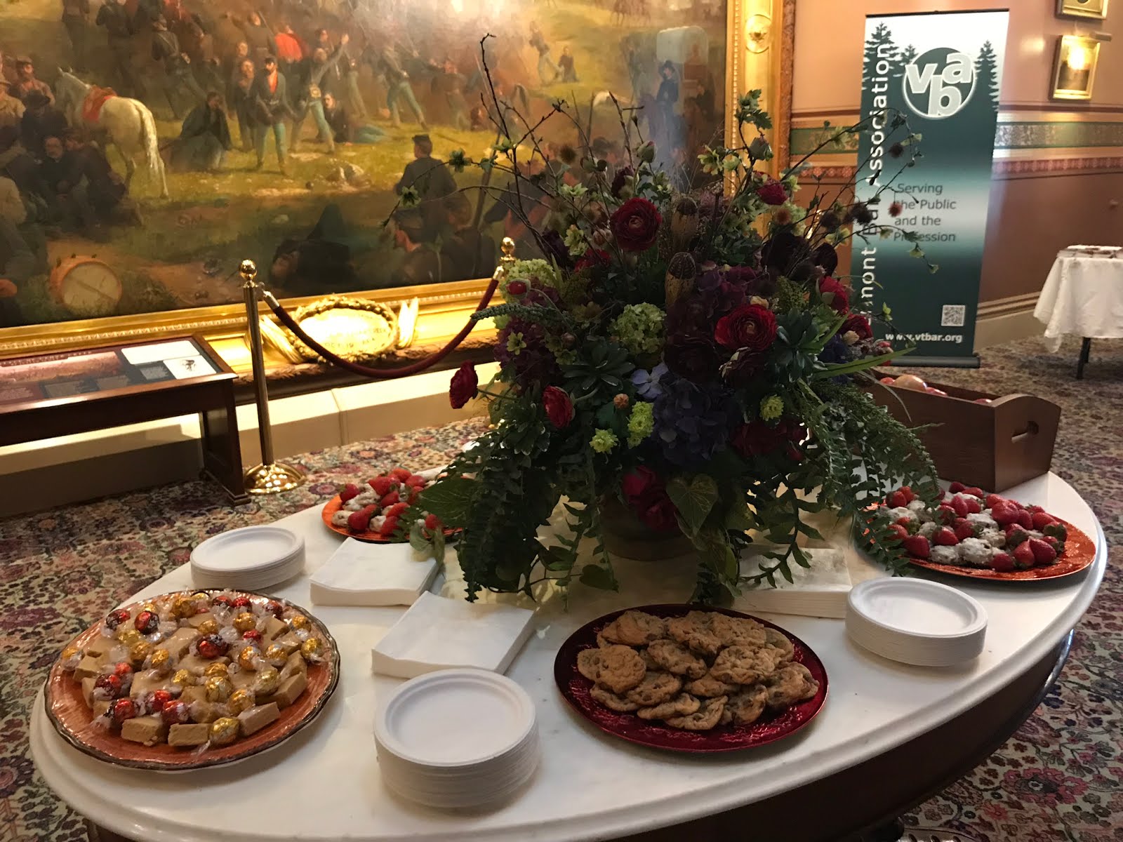 The ceremony was followed by a reception hosted by the Vermont Bar Association. The VBA executive director and staff were on hand to congratulate the new admittees and talk about Vermont practice over cookies and cider. Flyers demonstrating the benefits of VBA membership, of belonging to the Lawyer Referral Service panel, of joining low bono and pro bono panels and projects and of attending upcoming VBA CLE’s were also on hand. Other goodies included pocket constitutions, courtesy copies of the most recent Vermont Bar Journal and VBA logo trinkets such as notepads, tissues and lip balm.