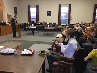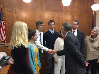 After administering the judicial oath, Governor Scott likewise praised the numerous qualities that led to Judge Treadwell’s appointment. Judge Treadwell thanked many in the audience with whom he had worked over the years, including Vermont Attorney General TJ Donovan; Executive Director of the State’s Attorneys and Sheriffs, John Campbell; numerous state’s attorneys and many of the judicial officers present including Justices Karen Carroll and Marilyn Skoglund and Judges Brian Grearson, Mary Miles Teachout, Mary Morrissey, John Pacht and Thomas Durkin. He also thanked his wife Tracy and their six children, his mother (who had traveled from New Zealand for the occasion!), his mother-in-law, sister-in-law and the many colleages and friends who were in attendance. Judge Treadwell’s first assignment will be in the Windham Civil Division in Newfane, starting in January.