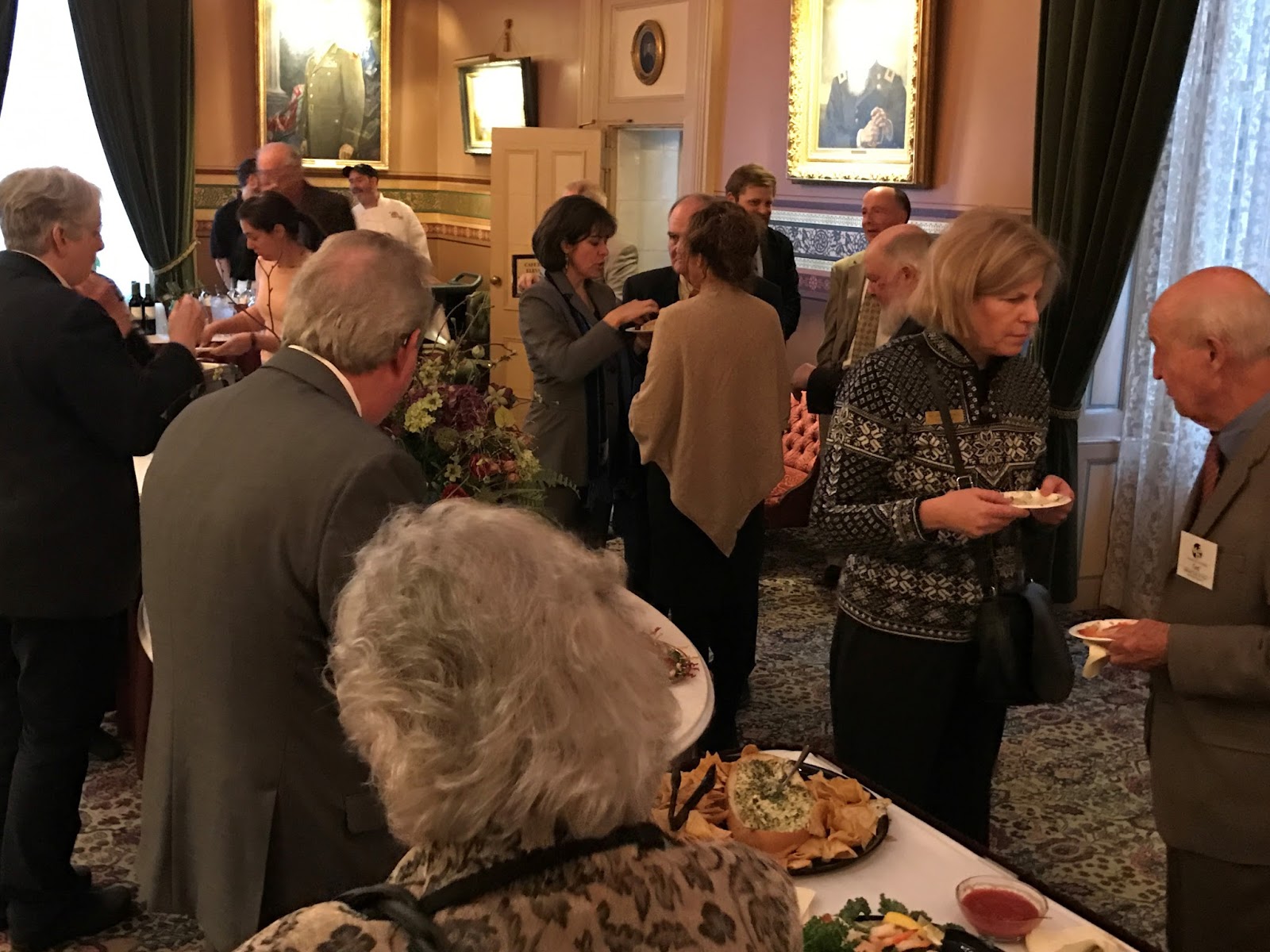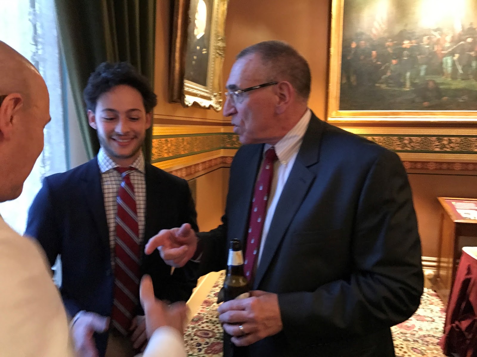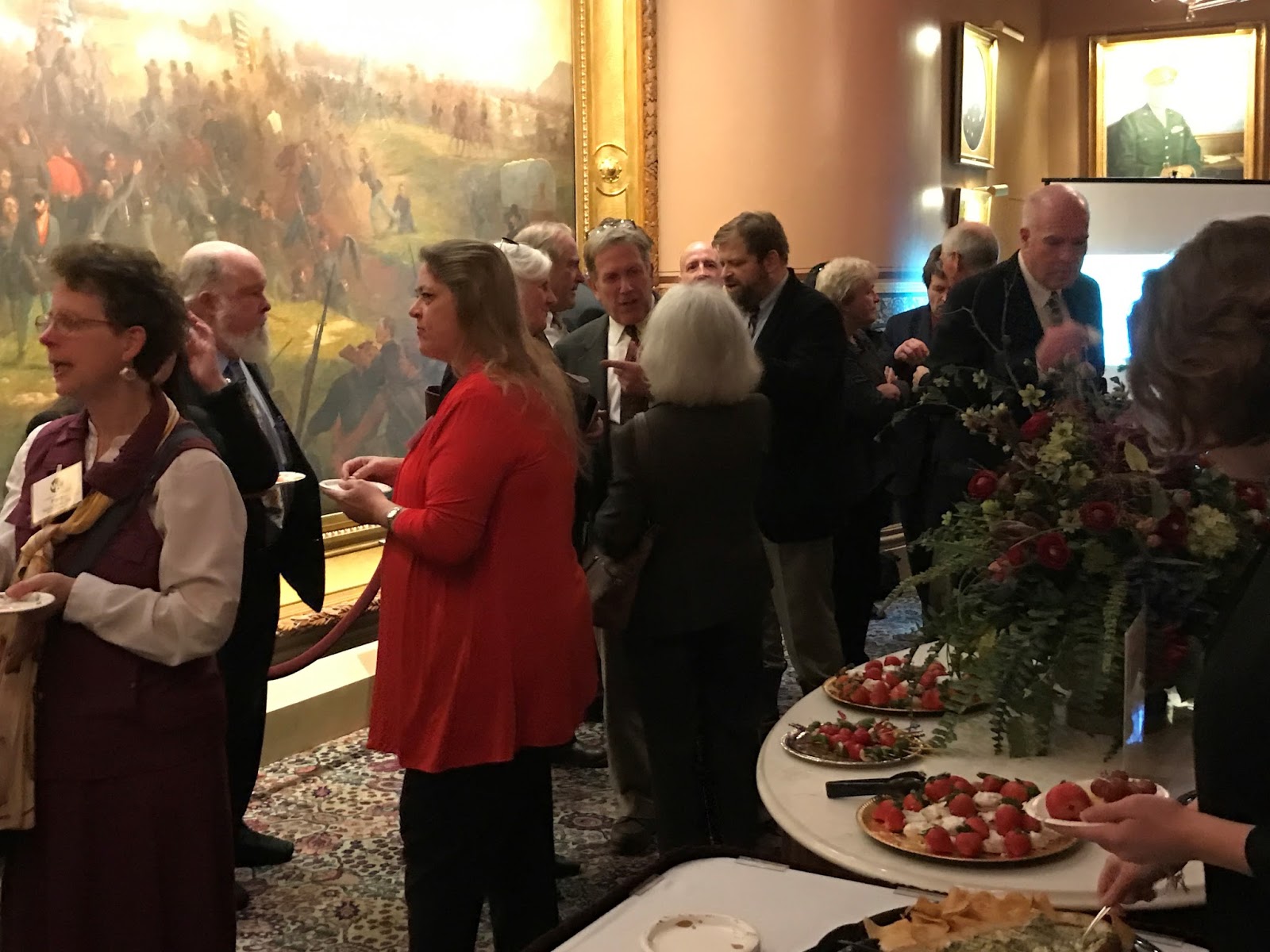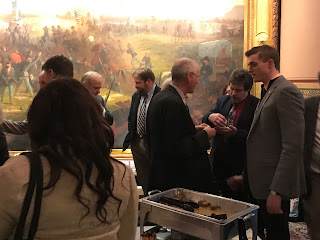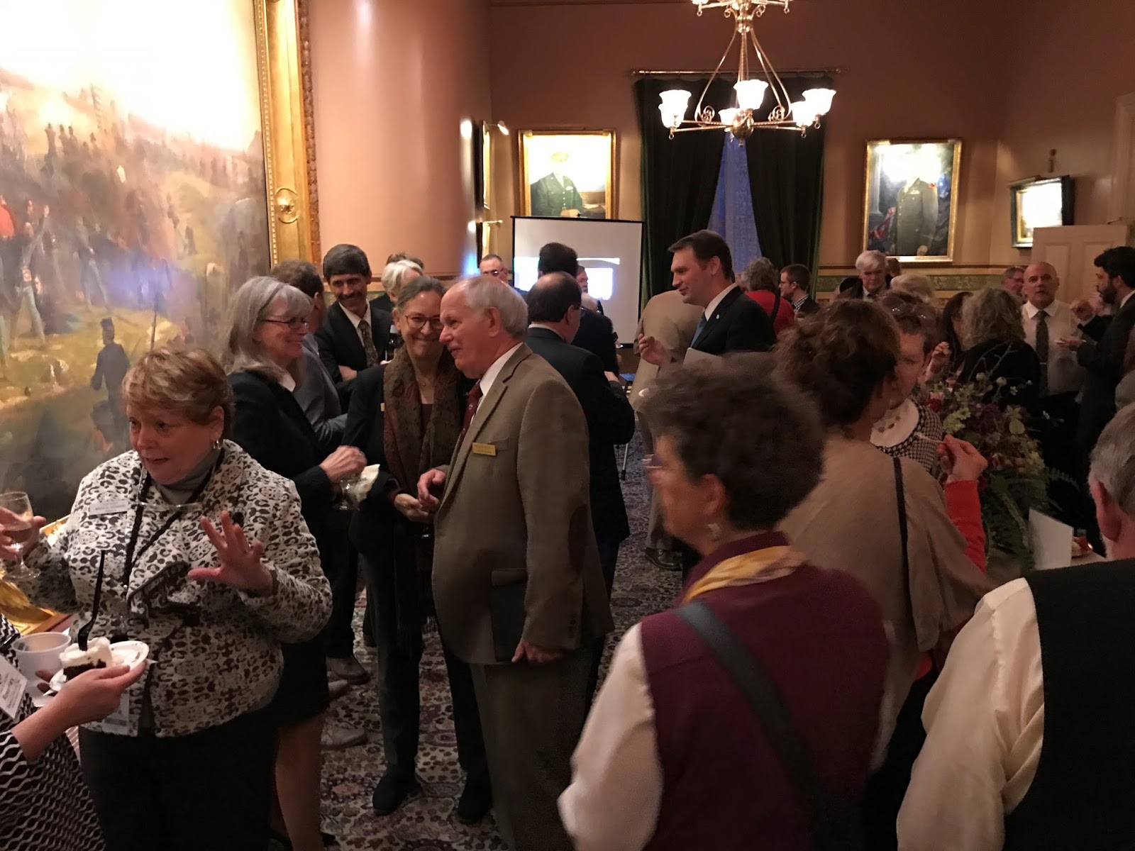 One picture that may not be self-explanatory is the close up of the large battle painting in the Cedar Creek Room. The bearded injured man being carried is Thomas Kennedy, a direct relative of our own VBA President, Mike Kennedy. Not only did this Kennedy survive his injury, but he later became a state official with stints as Sheriff of Franklin County, Town selectman and constable, superintendent and a two-term representative in the State legislature. His prominent position as a young star in the legislature, and perhaps his potential influence over future artist commissions, may explain his front and center position in the painting!